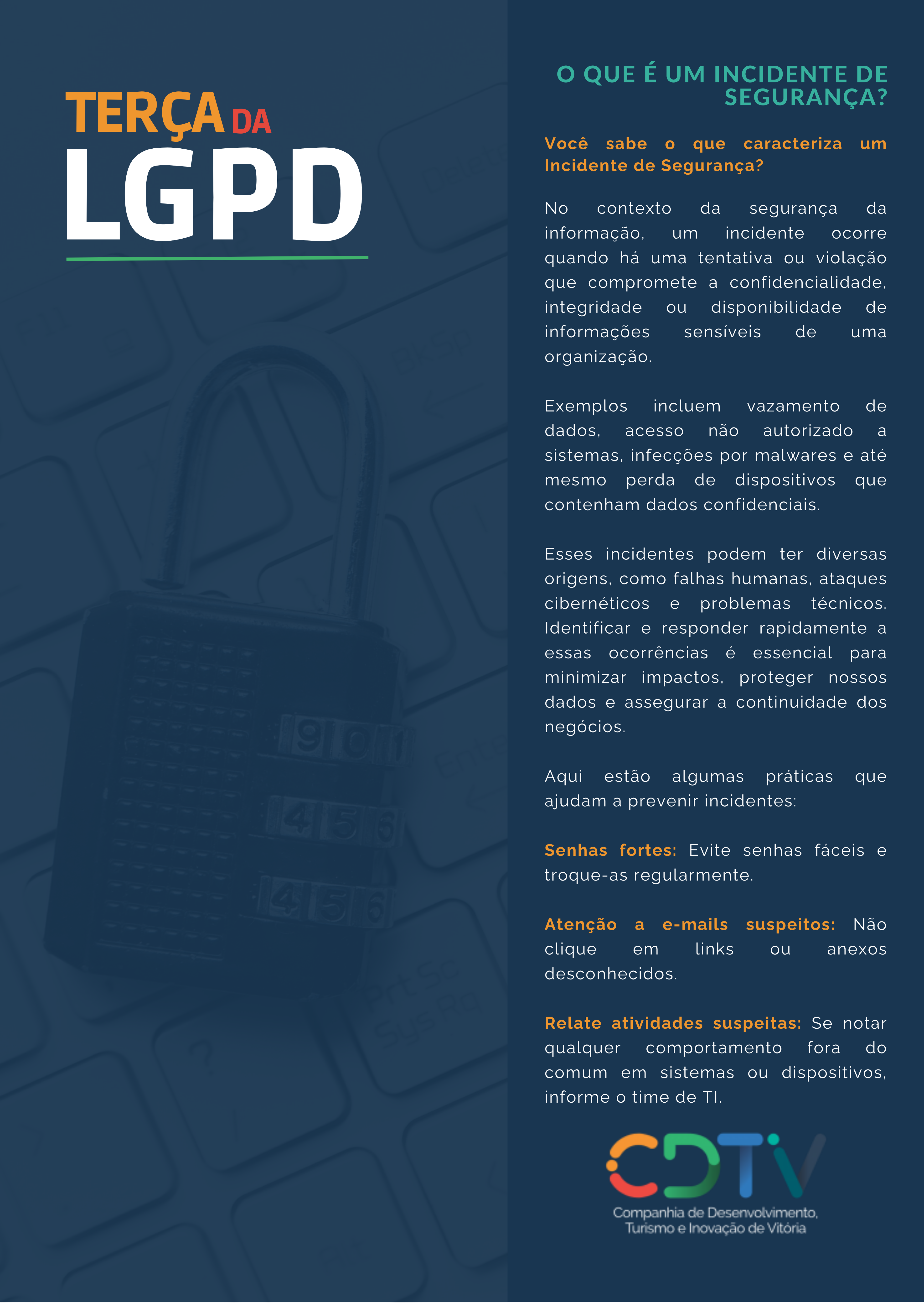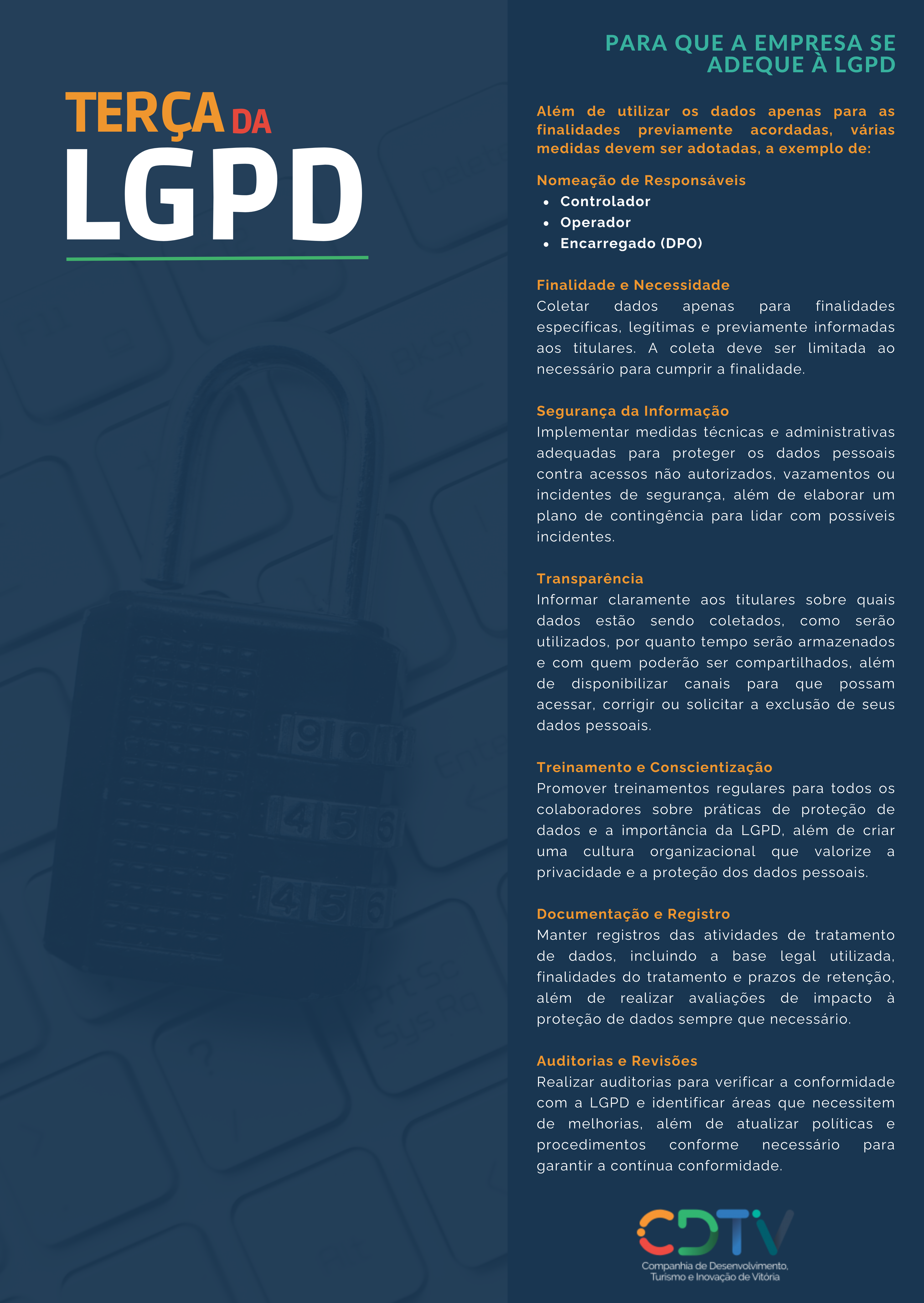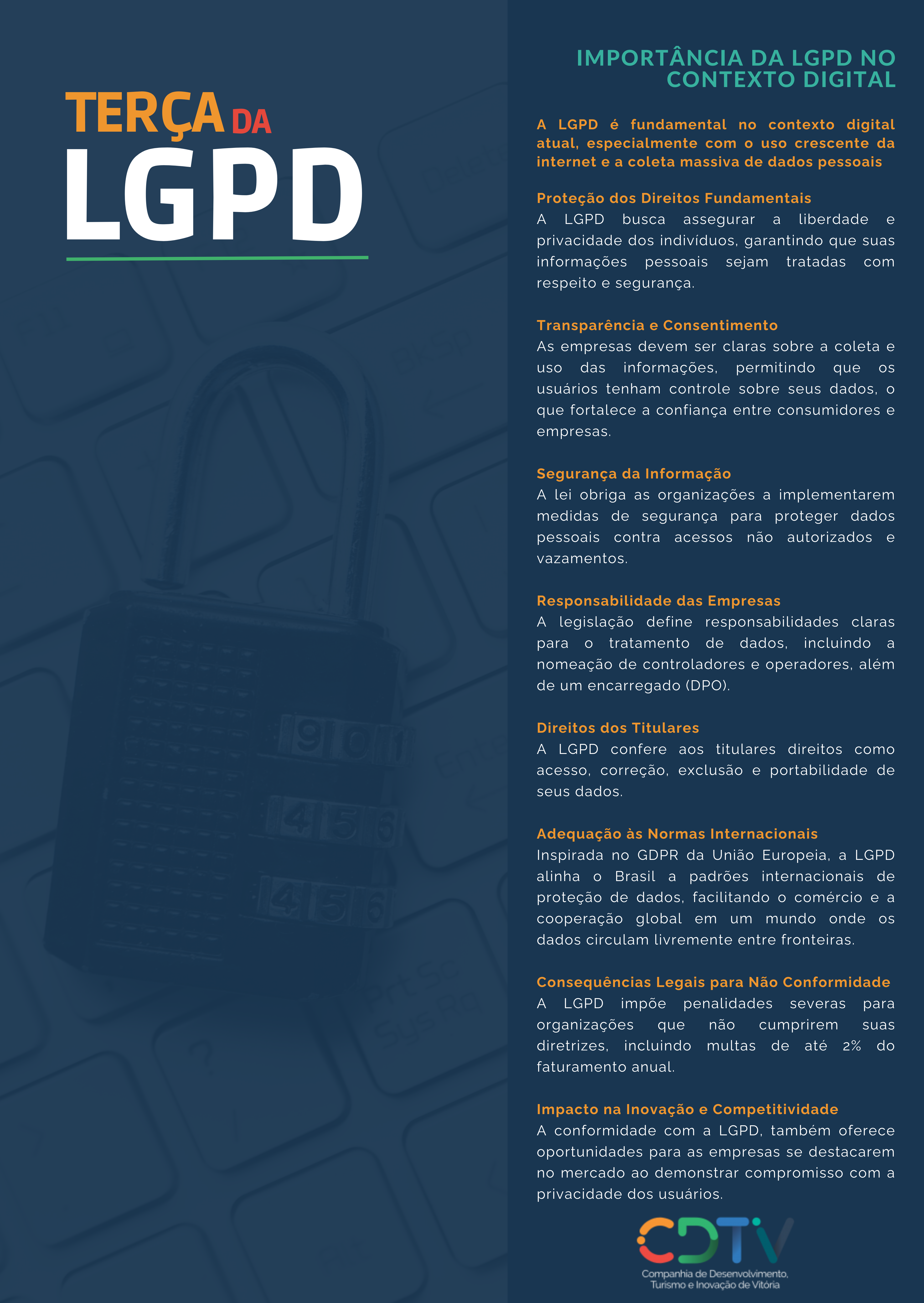 Como parte das iniciativas do programa, introduzimos a Terça da LGPD, uma ação semanal dedicada à disseminação de pílulas de conhecimento sobre a Lei Geral de Proteção de Dados. Toda terça-feira, serão compartilhados conteúdos concisos e práticos, abordando temas como: