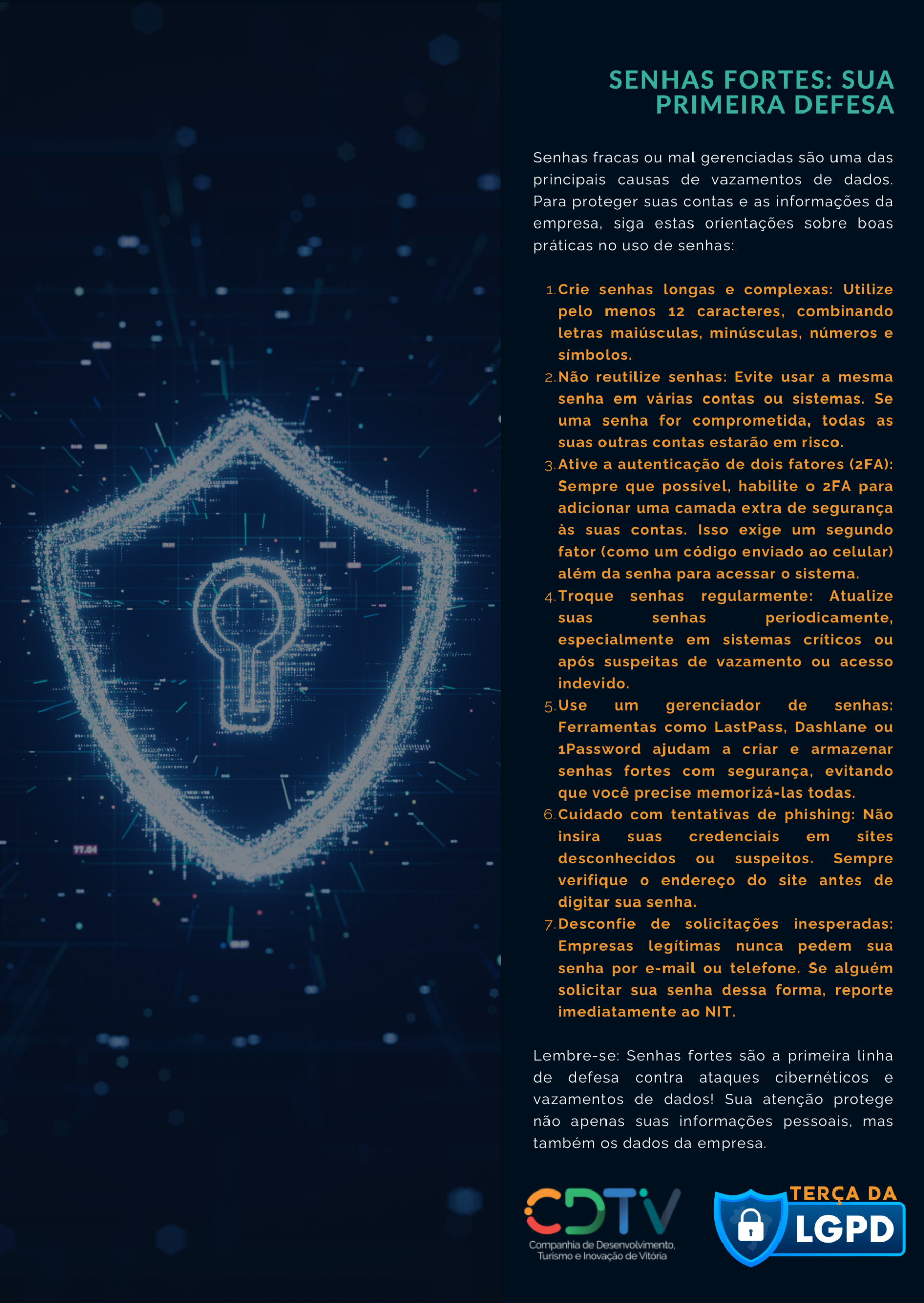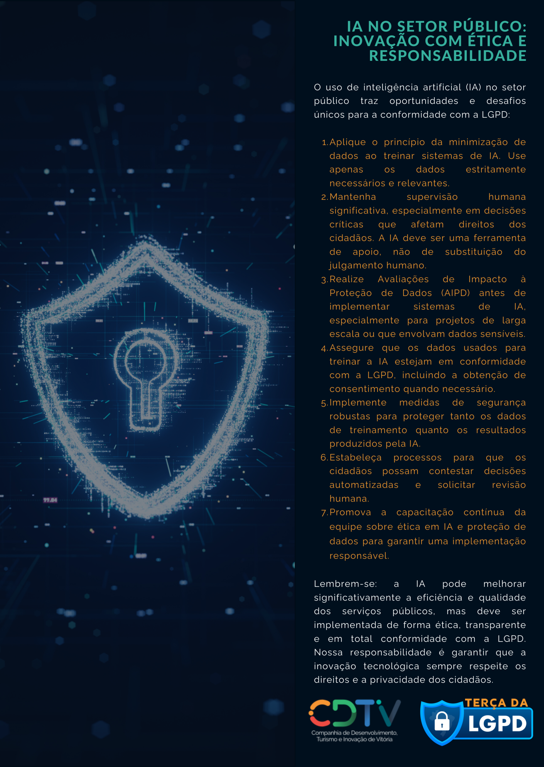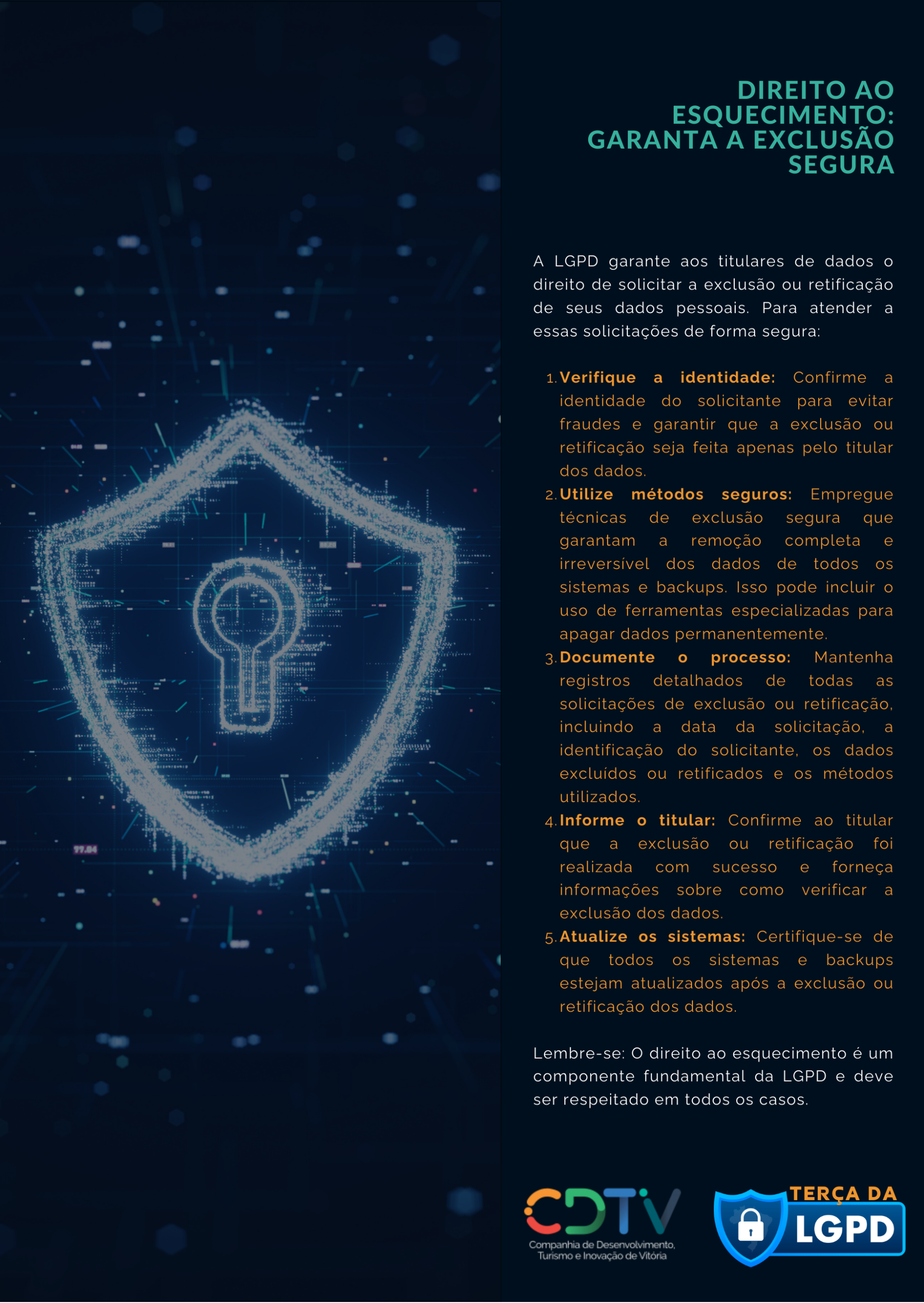 Como parte das iniciativas do programa, introduzimos a Terça da LGPD, uma ação semanal dedicada à disseminação de pílulas de conhecimento sobre a Lei Geral de Proteção de Dados. Toda terça-feira, serão compartilhados conteúdos concisos e práticos, abordando temas como: